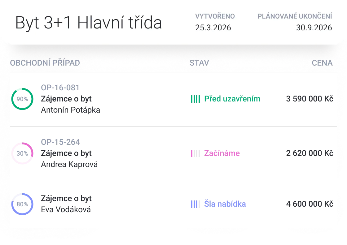 Na obchodní nástěnce vidíte, kolik zakázek máte rozjednaných, kolik peněz vám mohou vynést v provizích nebo v jaké jsou fázi. Hned třeba víte, zda teprve proběhne prohlídka, nebo už řešíte smlouvu.