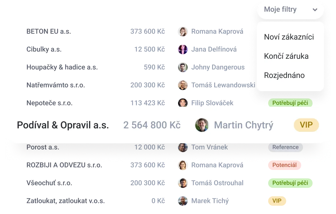 Všechna vaše data o klientech budou konečně přehledná, ať už jde o kontaktní informace, datum zakoupení výrobku nebo informace, které jste spolu řešili třeba telefonicky. Díky tomu budete vědět, kdy komu nabídnout jaký servis.