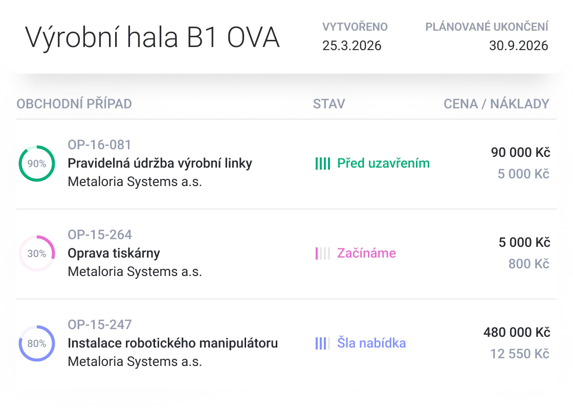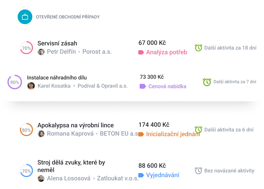 S CRM máte přehled o jednotlivých obchodech. Z jednoho místa vidíte, jestli už jste s klientem jednali o konkrétní mašině, nebo jestli už je poslaná nabídka. U prodaných strojů pak evidujete detailní informace ohledně jejich stavu, proběhlých servisů nebo konce záruční lhůty.