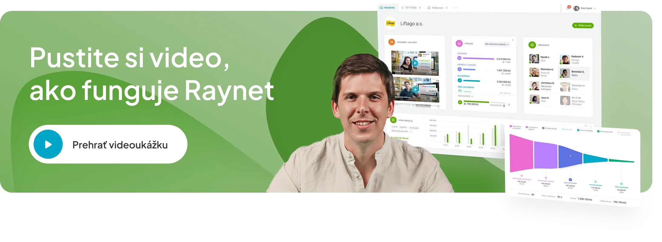 Raynet CRM je český cloudový nástroj pro řízení vztahů se zákazníky. Umožňuje firmám evidovat kontakty, řídit obchodní případy, plánovat aktivity a mít všechna obchodní data na jednom místě. Díky tomu zefektivňuje obchodní procesy a pomáhá zvyšovat prodeje.